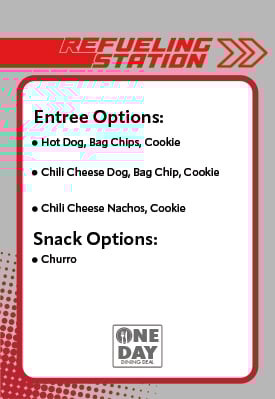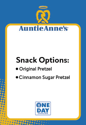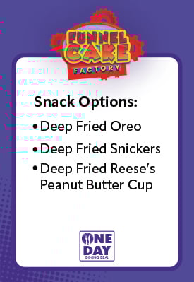 Enjoy two meals (includes an entree, side and dessert) and one snack at participating locations throughout Fun Spot America. Your first meal can be redeemed for lunch, and the second meal for dinner, with one snack available during the day.