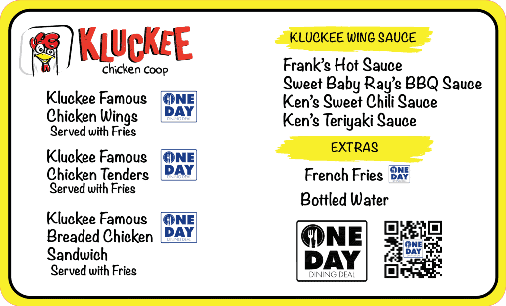 Kluckee Chicken Coop At Kluckee Chicken Coop, enjoy chicken tenderloins, sliders, sandwiches, and wings. See below for menu options.
