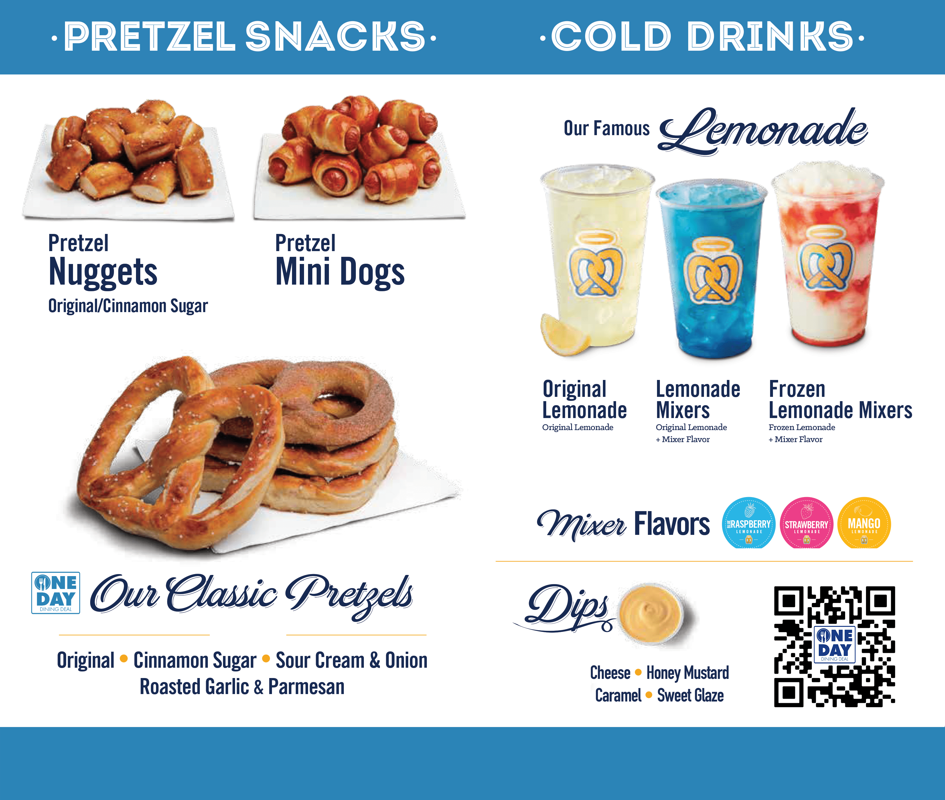 Auntie Anne’s Warm, delicious hand-baked pretzels and refreshing lemonade. See below for menu options.